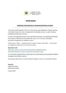 In a statement released on Monday, 2nd March, 2026 the Embassy explained that the registration process is necessary to ensure effective communication, assistance or possible evacuation arrangements for Ghanaian citizens amid the ongoing tensions between Iran and Israel and USA which has left other countries like Qatar in the region affected.