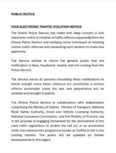 The Ghana Police Service has noted with deep concern a viral electronic notice of traffic offence purportedly issued by the Service, which notifies some individuals of alleged traffic violations and requests them to make payments.