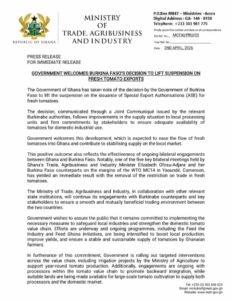 In a statement released by the Ministry of Trade and Agribusiness and Industry, the ministry stated that the decision by the Burkina Faso government is expected to ease the flow of fresh tomatoes into Ghana and contribute to stabilising supply on the local market.