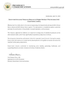The Government of Ghana has announced that effective ,Thursday April 16,2026 it will provide a relief package to ease the burden to petroleum consumers by absorbing GHC2.00 per litre on diesel and GHC0.36 per litre on petrol.
