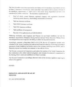 The Ministry also added that from there,pursuant to Regulation 260(7) of LI 2176, the two responsive tenders were submitted to the Tender Committee for technical and financial evaluation with Heath Goldfields Ltd, failing to achieve the minimum qualifying score of 80%.