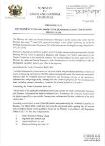 The statement also stated that per the mandatory requirements spelt out in Phase 1, Annexure C of the Notice, only Engineers and Planners Ltd and Heath Goldfields Ltd met the mandatory requirement with Maripoma Mining Services Ltd and Vortex Resources Mining Group being disqualified for failing to submit the required documents.