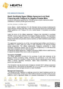 Heath Goldfields LTD, has announced the signing of a landmark gold offtake agreement with Trafigura Pte Ltd which will see to the Trafigura purchasing 700,000 ounces gold doré from the Bogoso-Prestea operation.