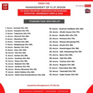 The Management and VIP JEOUN Transport has announced an increase in fare prices effective, Wednesday, April 8, 2026.